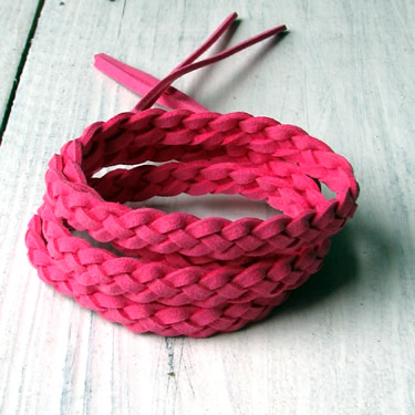 Gevlochten armband in paarstinten De veters zijn gemaakt van suedine (imitatieleer). De lengte van de armband is ±85cm en de breedte is 7mm. Zeer…