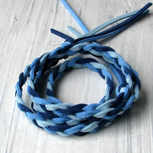 Gevlochten armband in blauwtinten De veters zijn gemaakt van suedine (imitatieleer). De lengte van de armband is ±85cm en de breedte is 7mm. Zeer…