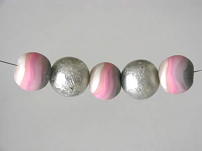 Formaat: ± 16mm Materiaal: FIMO, ongelakt Kleur: parelmoer, rozetinten, zilver